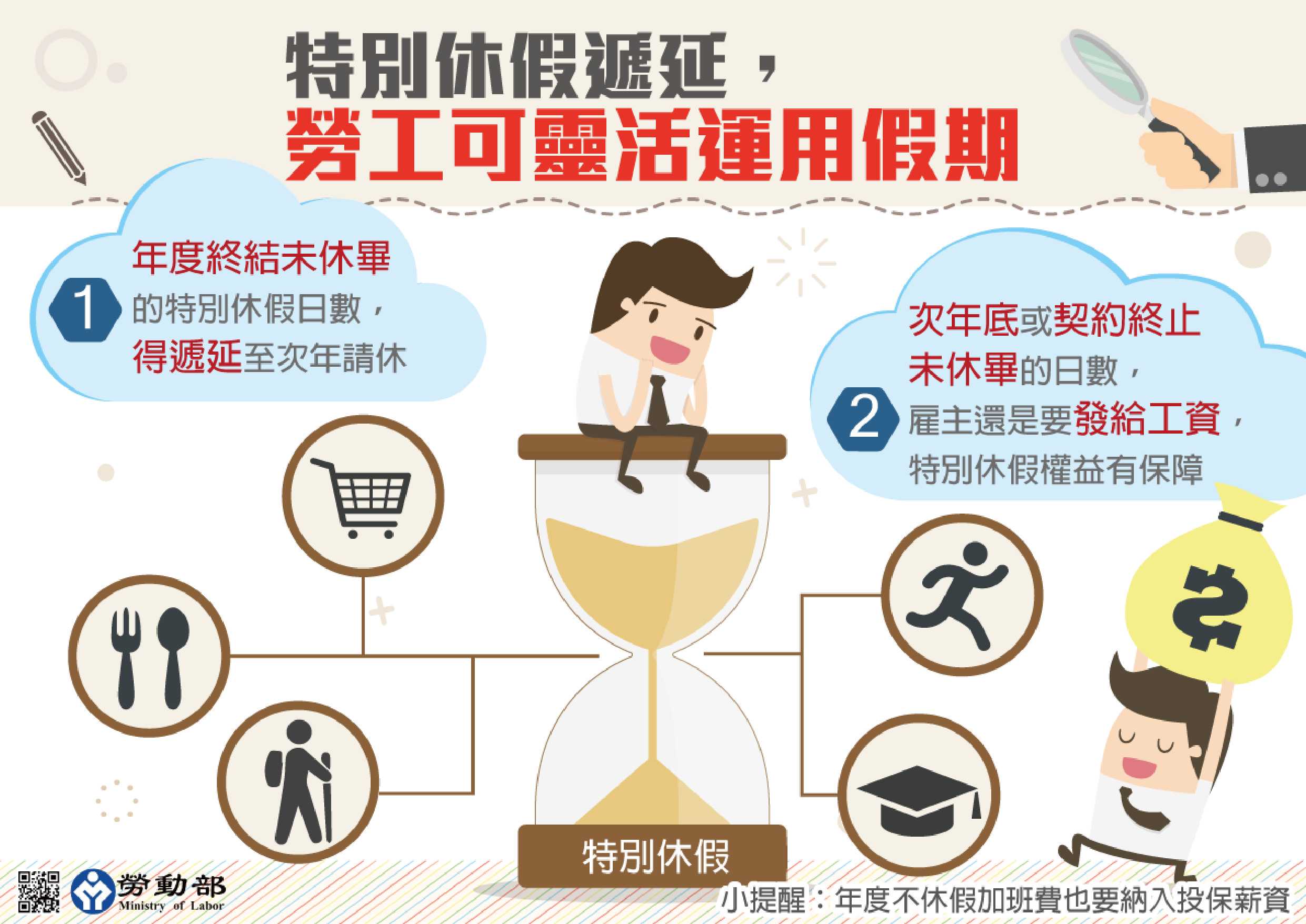 勞工之特別休假,因年度終結或契約終止而未休之日數,雇主應發給工資。但年度終結未休之日數,經勞雇雙方協商遞延至次一年度實施者,於次一年度終結或契約終止仍未休之日數,雇主應發給工資。